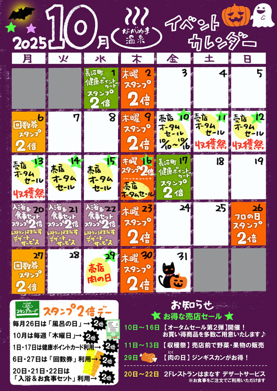 ながぬま温泉では10月もお得がいっぱい!イベントdaysを開催いたします。イベントカレンダーをチェックして、ながぬま温泉をお得に楽しみましょう♪