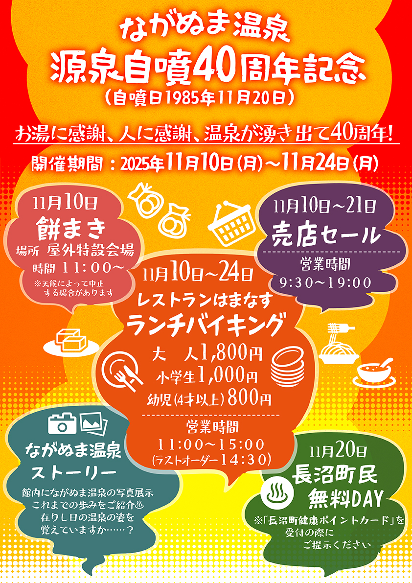 おかげさまで、ながぬま温泉は今年で源泉自噴40周年を迎えます。日頃の感謝を込めて、11月10日(月)~11月24日(月)の期間中、記念イベントを開催!「お湯に感謝、人に感謝、温泉が湧出て40周年!」をテーマに、町内外の皆さまに楽しんでいただける企画をご用意しています。ぜひ、湧き出る源泉に思いを馳せながらながぬま温泉をご堪能ください♨