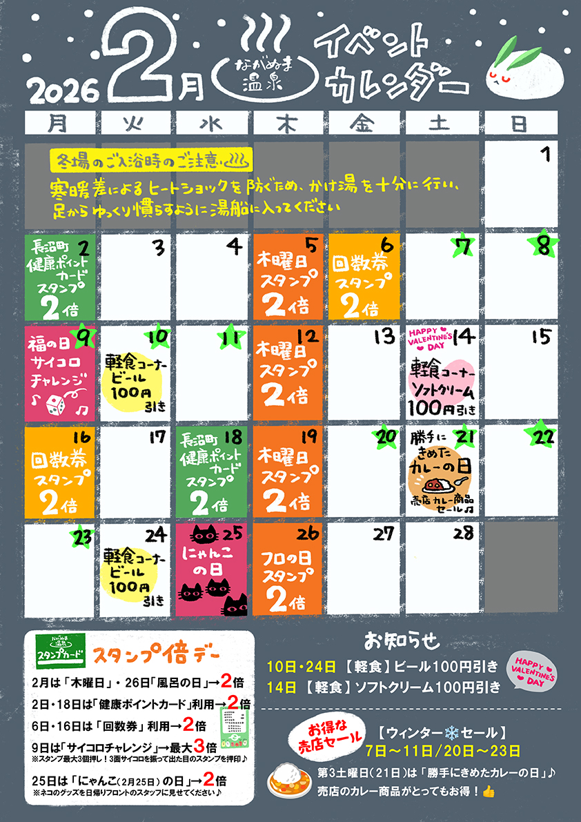 ながぬま温泉では2月もお得がいっぱい!イベントカレンダーをチェックして、ながぬま温泉をお得に楽しみましょう♪