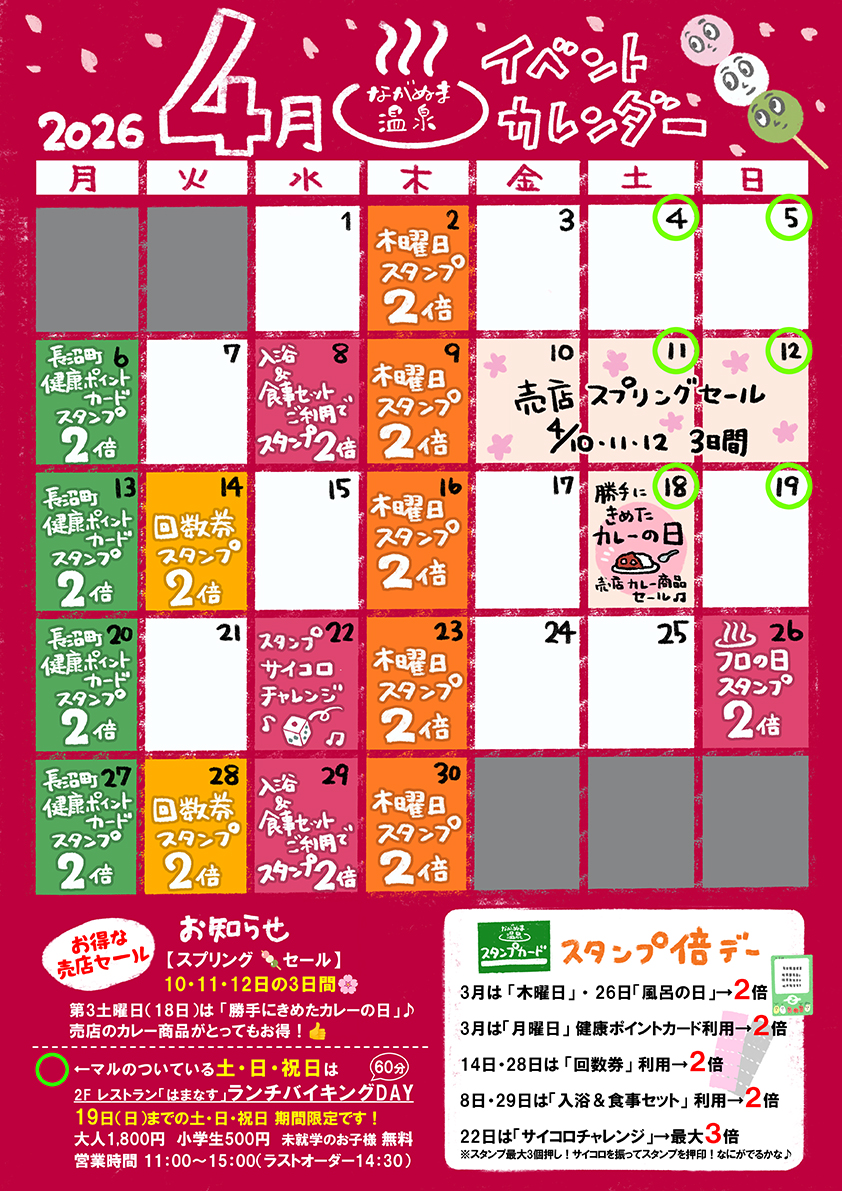 ながぬま温泉では4月もお得がいっぱい!イベントカレンダーをチェックして、ながぬま温泉をお得に楽しみましょう♪