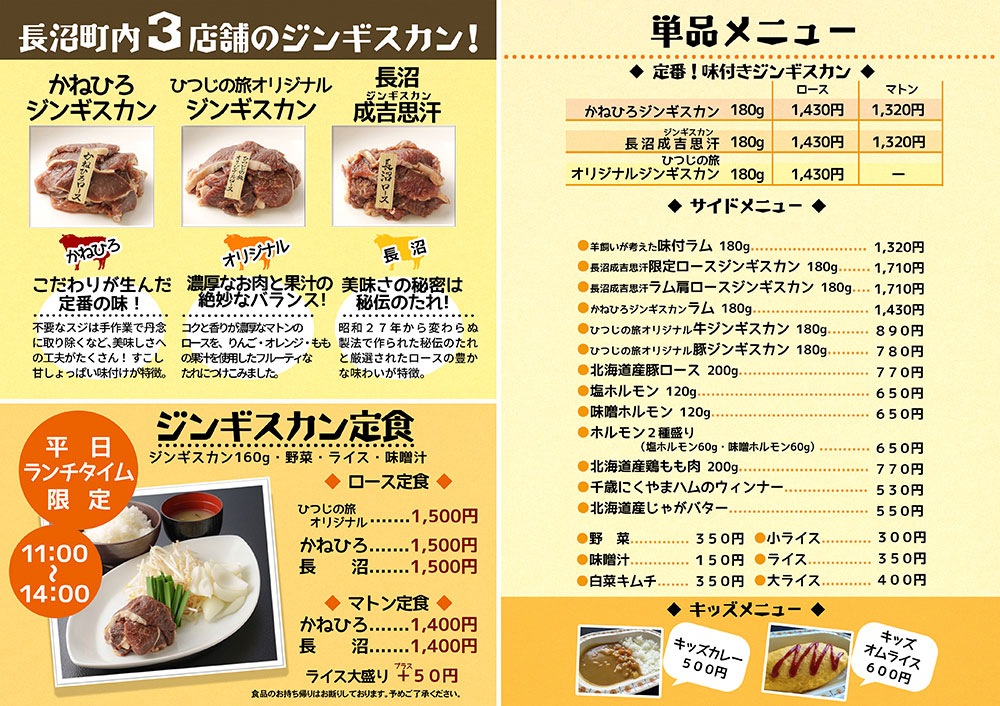 「ひつじの旅オリジナル」「かねひろジンギスカン」「長沼成吉思汗」3種のジンギスカンがお楽しみいただけます。